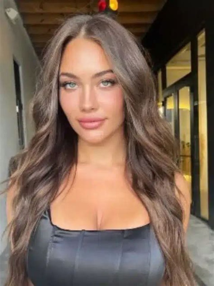 - Her hair color is dark brown.