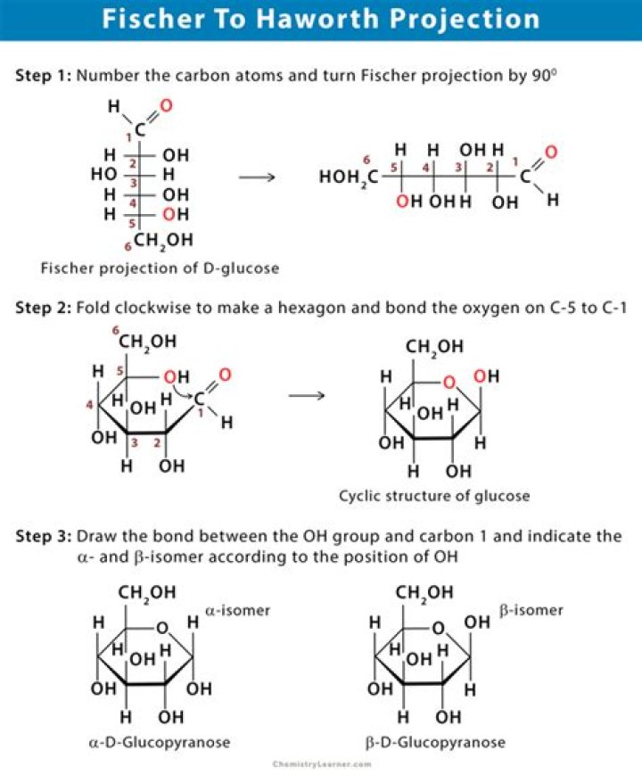 Steps for Converting Fischer to Haworth If your sugar was D, then the carbon #6 is going to be looking “up” (down for the L sugar) The “right” groups on carbons 2, 3, and 4 in the Fischer projection go onto the “bottom” positions in Haworth.Click to see full answer. Furthermore, what is the difference between a Fischer projection and a Haworth projection?While Fischer projections are used for sugars in their open-chain form, Haworth projections are often used to depict sugars in their cyclic forms. The beta diastereomer of the cyclic form of glucose is shown below in three different depictions, with the Haworth projection in the middle.Furthermore, how do you go from Fischer projection to bond line? To convert the Fischer projection to a bond line formula you just draw a zig-zag line of six carbon atoms. Then you put an aldehyde group at C-1 and OH groups on each of the other five carbon atoms. Note that the bond line formula gives no stereochemical information. Then, what is Haworth projection formula? A Haworth projection is a common way of writing a structural formula to represent the cyclic structure of monosaccharides with a simple three-dimensional perspective. Organic chemistry and especially biochemistry are the areas of chemistry that use the Haworth projection the most.How do you draw a Fischer projection of glucose?In a Fischer projection, you draw the chain vertically, with the aldehyde group at the top. The bonds above and below any two adjacent carbon atoms are behind the plane of the paper. The horizontal bonds are coming out of the paper.
