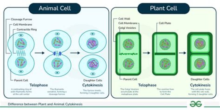 Name the structures that complete cytokinesis in both plant and animal cells. Animal cells divide by a cleavage furrow. Plant cells divide by a cell plate that eventually becomes the cell wall. Cytoplasm and cell membranes are necessary for cytokinesis in both plants and animals.Click to see full answer. In respect to this, what is the main difference between cytokinesis in plants and animals quizlet?Explain the main difference between cytokinesis in animal cells and cytokinesis in plant cells. In animal cells, cytokinesis begins with a pinching inward of the cell membrane midway between the cell’s two poles. This cleavage furrow separates the dividing cell into two cells.Similarly, what is the main difference between cell division in plants and animals quizlet? One division that results in two diploid daughter cells identical to the parent cell. How does cell division differ between plant and animal cells? Mitotis division in plants follows the same basic pattern that occurs in animals, with some notable exceptions. The cells of most plants do not have centrioles. Similarly, it is asked, which part of cell division is different in plant and animal cells? Mitosis is a type of cell division and it has several phases: prophase, metaphase, anaphase, and telophase. But, plant and animal cells differ in cytokinesis, a cytoplasmic division at the end of mitosis. This is because plant cells have the cell wall, unlike animal cells, so cytokinesis must differ.What happens during cytokinesis in animal cells?During cytokinesis, the cytoplasm splits in two and the cell divides. In animal cells, the plasma membrane of the parent cell pinches inward along the cell’s equator until two daughter cells form. In plant cells, a cell plate forms along the equator of the parent cell.