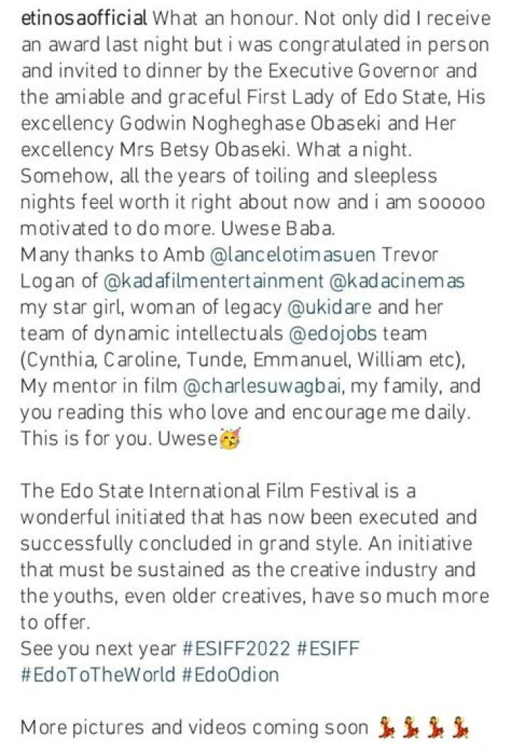 A thrilled Etinosa communicated how respected and thankful she was for the acknowledgment.