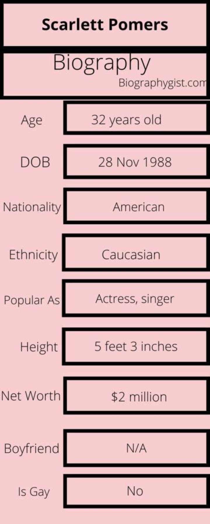 It is reported that Scarlett Pomers has an estimated net worth of $2 million.