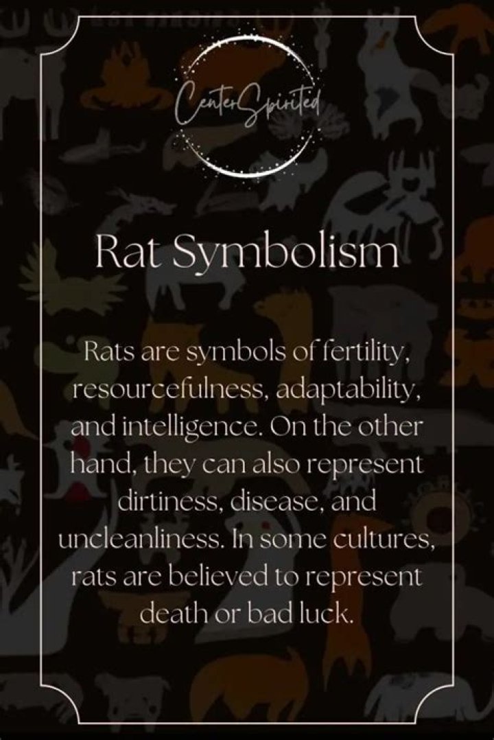 When the rat spirit animal appears to you, you have things in your life that are keeping you from reaching the stars. The rat meaning also indicates wealth, abundance, and fertility, similar to the rabbit meaning. Don’t fear the rat spirit animal because this symbolizes an abundant period that will soon take place!Click to see full answer. Furthermore, what does a rat symbolism? Symbolizing Intelligence The Rat symbolizes intelligence in culture, which means both cuteness and shrewdness. As a matter of fact, the Rat lives in nature and can react to natural disasters, such as earthquakes, flood, drought, and a plague of locusts, so it was considered to be a godly creature by the ancient people.Similarly, what does seeing a rat in a dream mean? Rats symbolize being dishonest. To see a rat in your dream, it signifies feelings of doubt, greed, guilt, unworthiness and envy. You keep something to yourself that eats you inside, or you might have done something that you are not proud of. Alternatively, rats in a dream denote repulsion, decay, dirt and even death. Moreover, what does it mean when a rat crosses your path? The provenances of the omen with respect to a rat crossing your path traceall the way back to Roman times . It is believed to that if a ratcrosses your path , you ‘d face treacherous servants and negativebehavior all day .What do rats mean in a dream biblically?This is probably why we use the phrase “He or she will rat on you” meaning he or she will betray you. The rat is a symbol of stealing, lying and backstabbing other people. The biblical meaning of rats is related to keeping secrets as well. To dream of rat means you fear being punished for your sins in biblical terms.