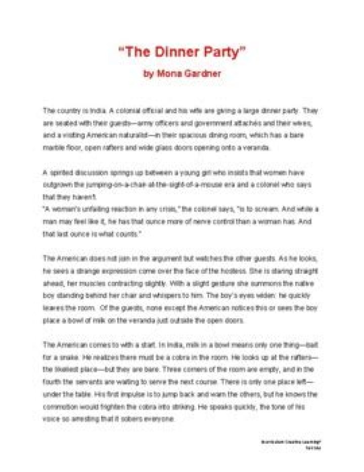 The theme of the short story The Dinner is that both men and women are equally courageous and can have control of a situation.Click to see full answer. Similarly, you may ask, what is the dinner party by Mona Gardner about?“The Dinner Party” by Mona Gardner is about a party in India, in which a colonel and a girl argue about how women act in a crisis. An American naturalist who is at the party is watching the argument and sees the hostess, who is acting strangely, gesture for a bowl of milk to be put outside the door.Also, who wrote the dinner party short story? There is very little information to be found about Mona Gardner. She was an American author who had her story “The Dinner Party” published in The Saturday Review of Literature in 1941. The story takes place in India during the time that it was a British colony. Britain ruled over India from 1858-1947. Keeping this in view, what is the climax of the story the dinner party? Climax: The snake goes for the bowl of milk and the American shuts the veranda doors, as other guests panic.Who is Mona Gardner?Mona Gardner. Mona Gardner is a author of many books, her childhood was as good as a normal childs life should be. she grew up wanting to write books and publish as a good author like she is now. she enjoy making books and writing.