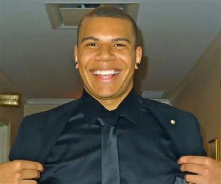 He has black hair and brown eyes.